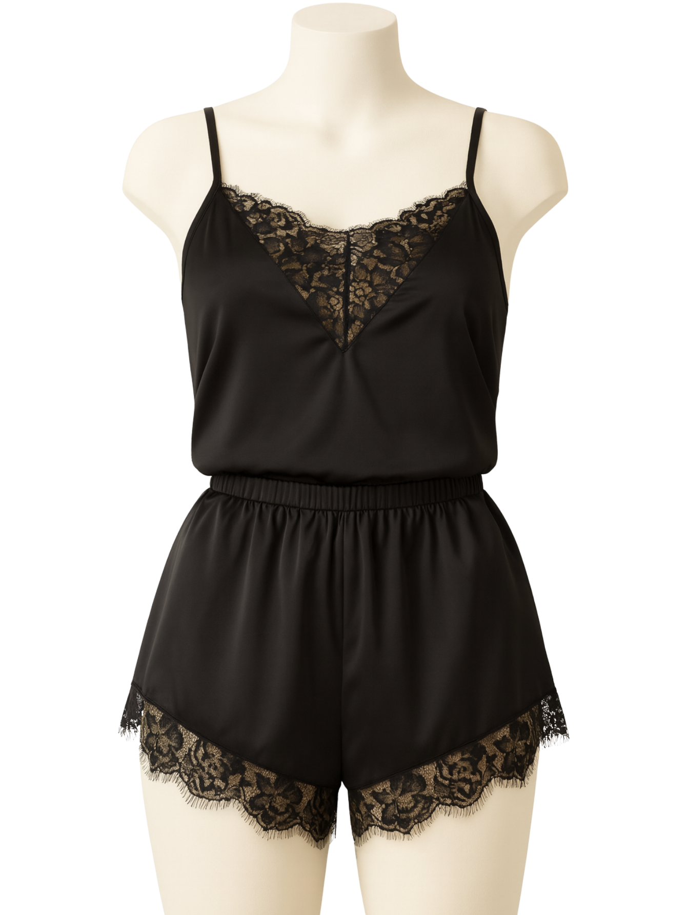 ZMYSŁOWA SATYNOWA DWUCZĘŚCIOWA PIŻAMKA OZDOBIONA CZARNĄ KORONKĄ