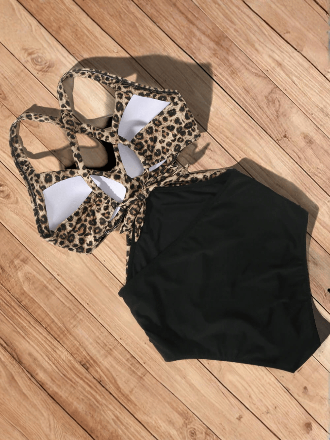 W kolorze różowym i panterka strój wiązany jest na plecach, a ramiączka krzyżują się z tyłu.